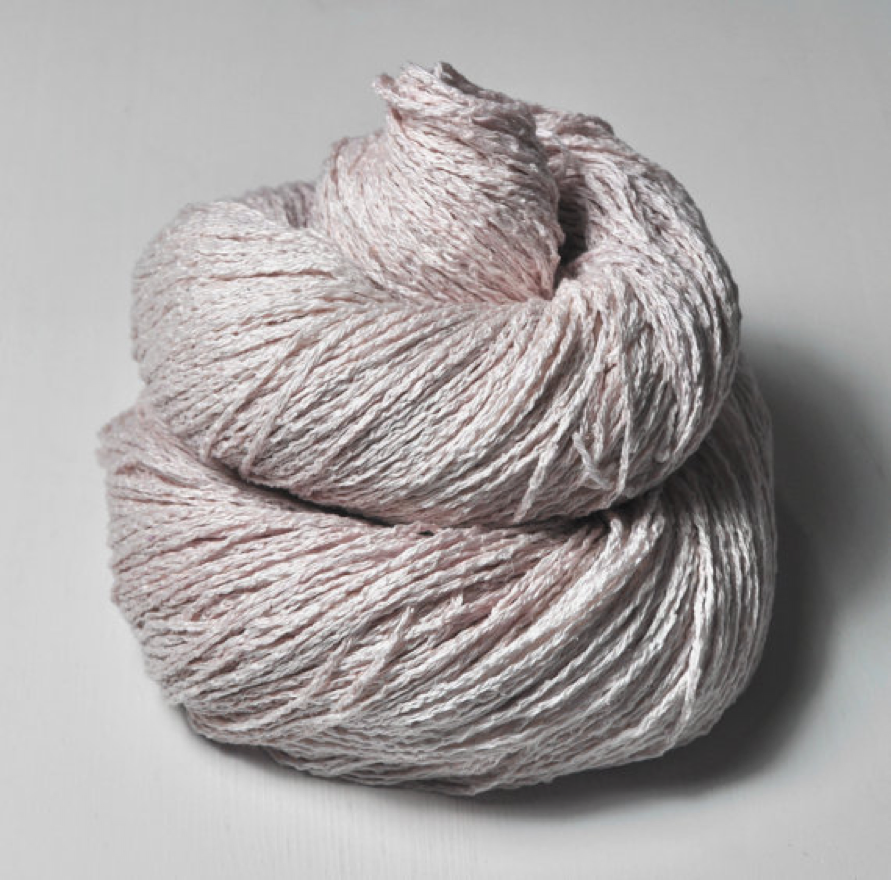 Das Garn besteht aus einem matten Seidenfaden, verwoben mit dünnen weißen Leinen. Da das Leinen die Farbe nicht so stark und schnell annimmt wie Seide, entsteht eine Optik, ähnlich wie bei einem Tweedgarn.